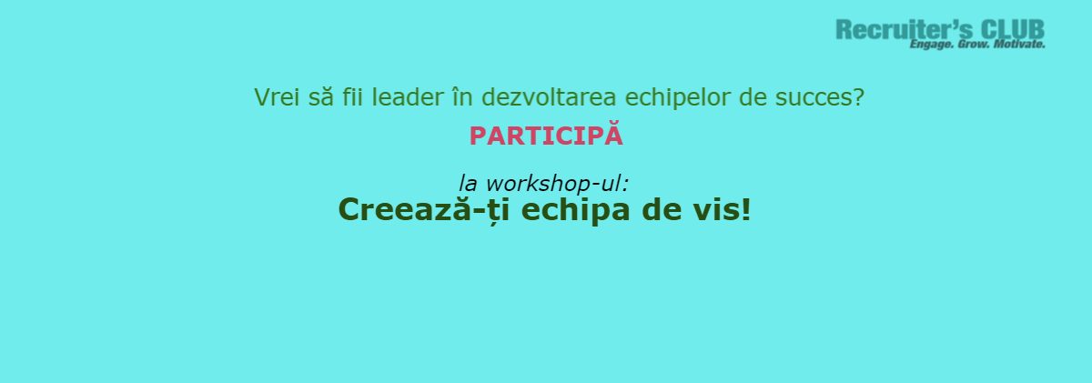 De această dată Recruiter's CLUB ți-a pregătit un eveniment special - două workshopuri ce îți dezvăluie aspecte importante ale procesului de creare și dezvoltare al echipei de vis.