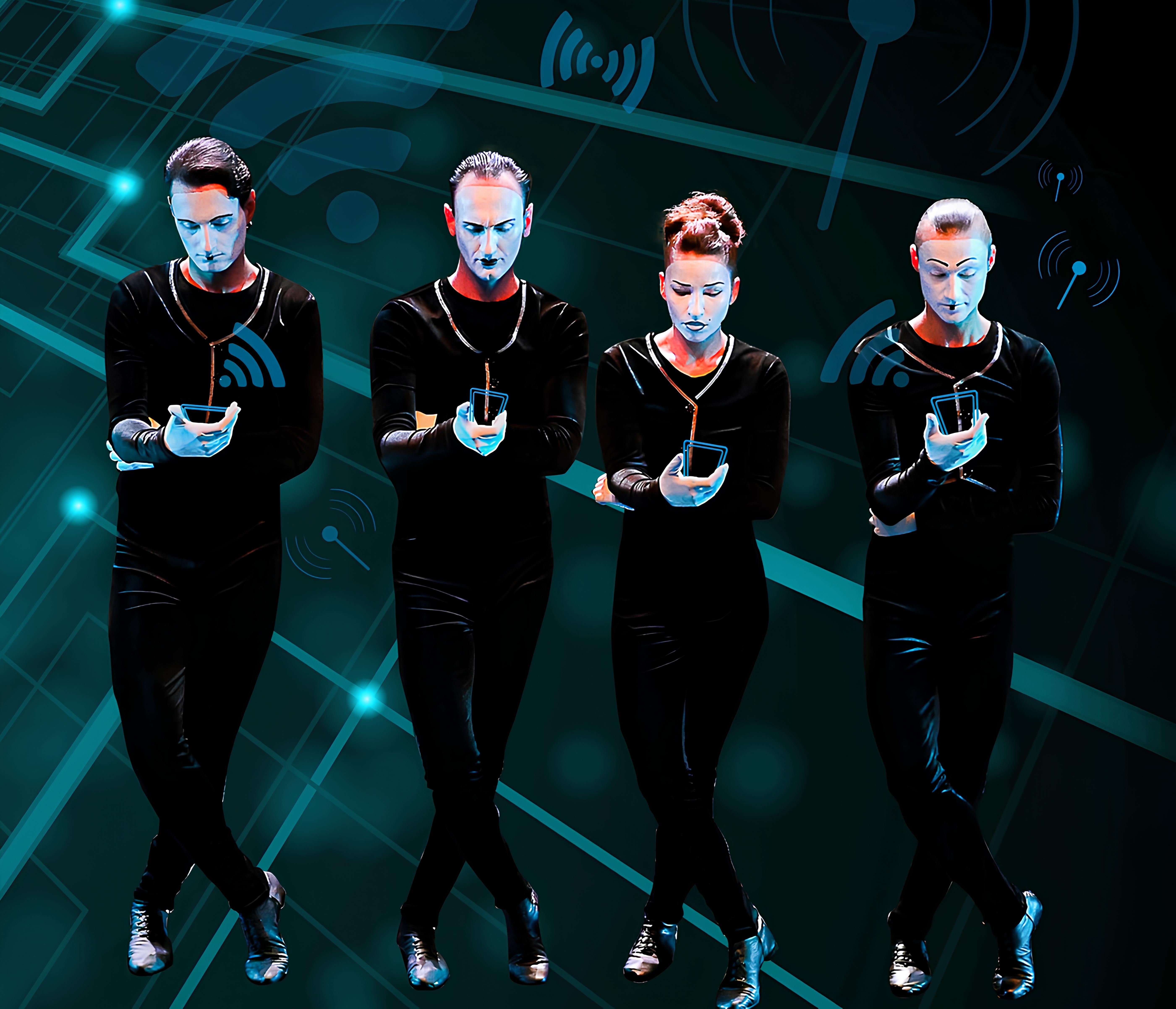 A physical theatre and pantomime show that explores, with humor and visual poetry, our hyperconnected world. Without sets and without words, the four artists transform the stage into a universe full of images, characters, and familiar situations: from Instagram and TikTok to interactive games, exploring the virtuality of the world through pantomime.