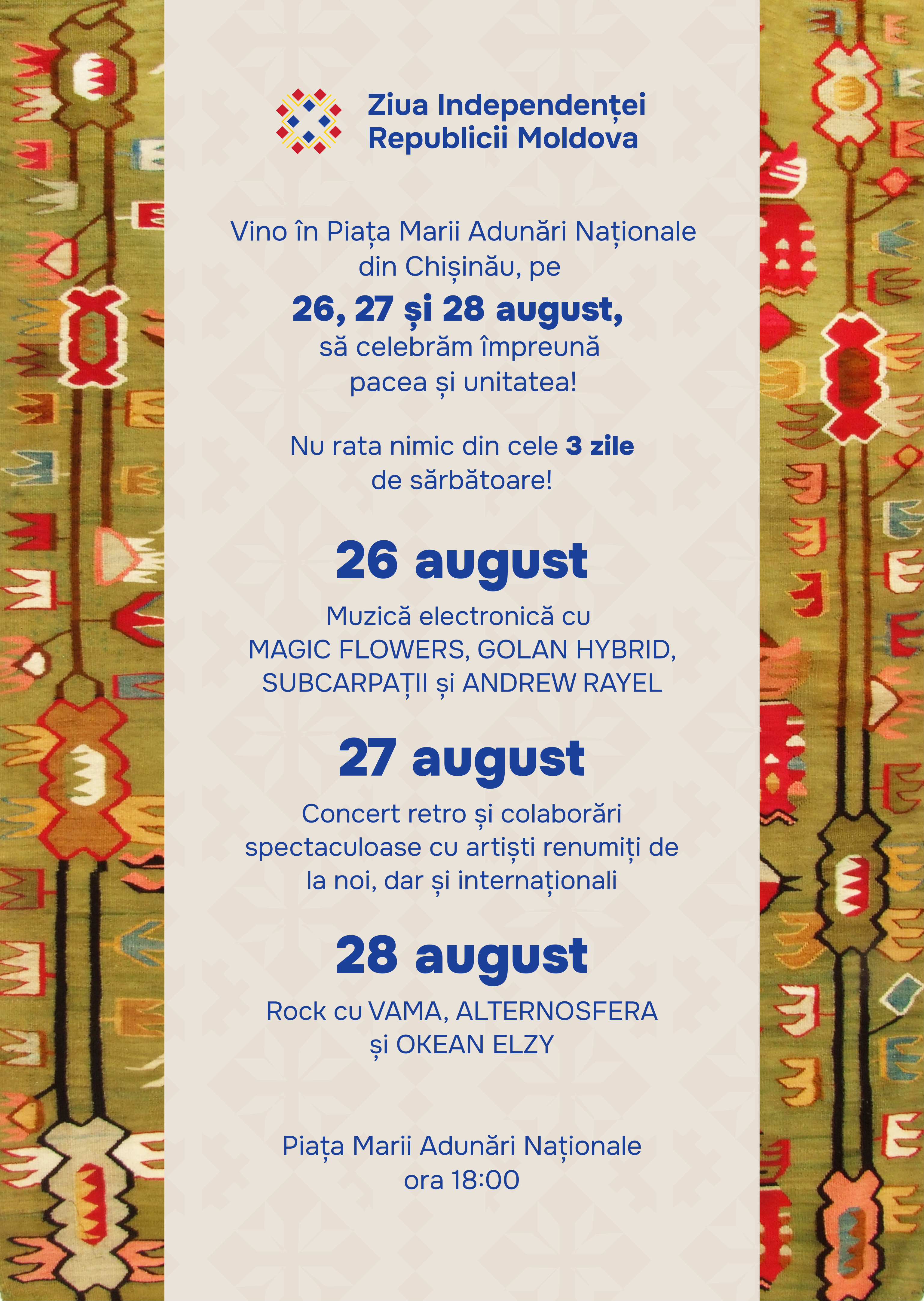 16 august, Chișinău - Ziua Independenței Republicii Moldova, marcată anual pe 27 august, va fi sărbătorită, printr-un program cultural de excepție pe 26, 27 și 28 august. În Piața Marii Adunări Naționale vor evolua artiști de renume atât locali, cât și internaționali.